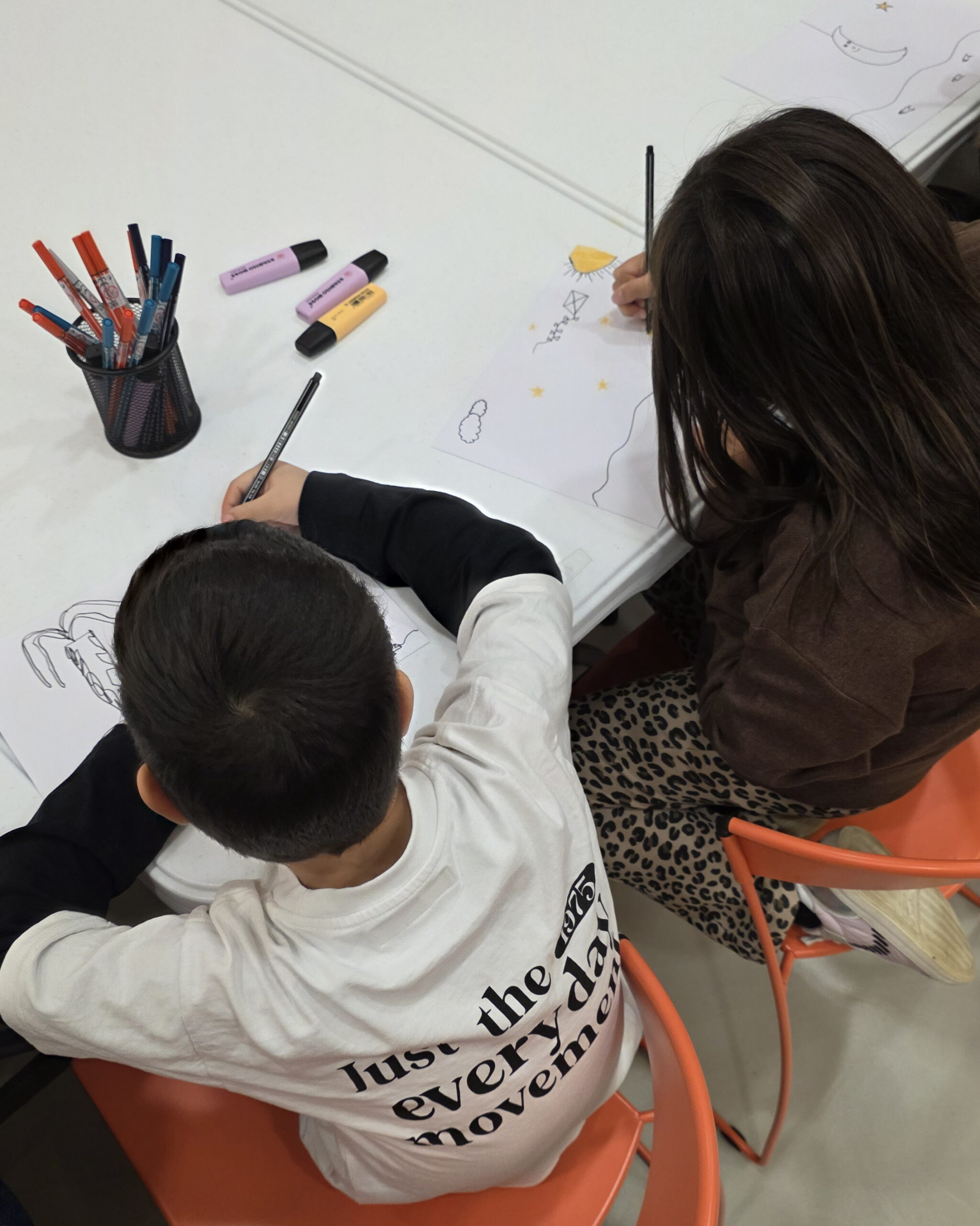Insieme a lui abbiamo realizzato un laboratorio creativo che ha coinvolto i bambini dell’azienda. Un viaggio essenziale e poetico, fatto di gesti semplici e profondi: partire da un foglio bianco, ascoltare la melodia del proprio nome, incontrare il proprio riflesso nello specchio, lanciare un aeroplanino, custodire una piccola scatola con un bulbo da piantare.
